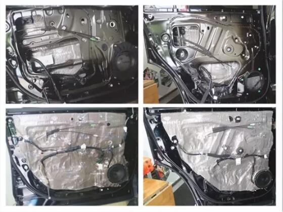 下面開始門板的隔音,技師用兩塊減震板分別鋪滿內(nèi)外門板,隔音施工完畢形成一個密封的箱體。