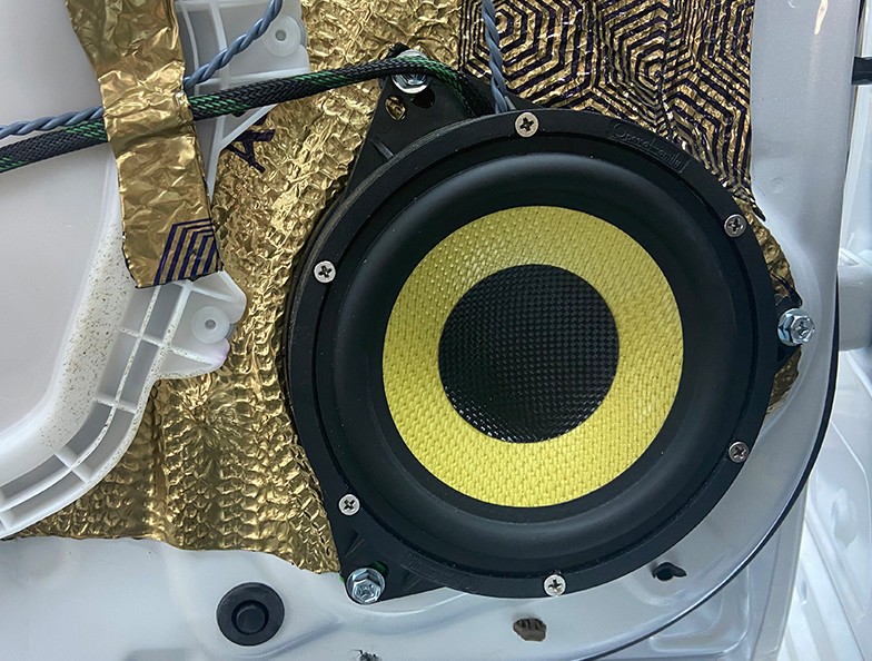 前聲場安裝一套邁博特神話三分頻喇叭,高音單元安裝于三角位,中音單元安裝在儀表臺上,這樣可以為駕駛位獲取非常好的聆聽體驗,中低音單元原位安裝在車門板,三頻之間相互呼應(yīng)銜接,在一臺歌劇世家VA 66六路功放的推動下,做主動分頻設(shè)計,讓三分頻出來不錯的音質(zhì)。