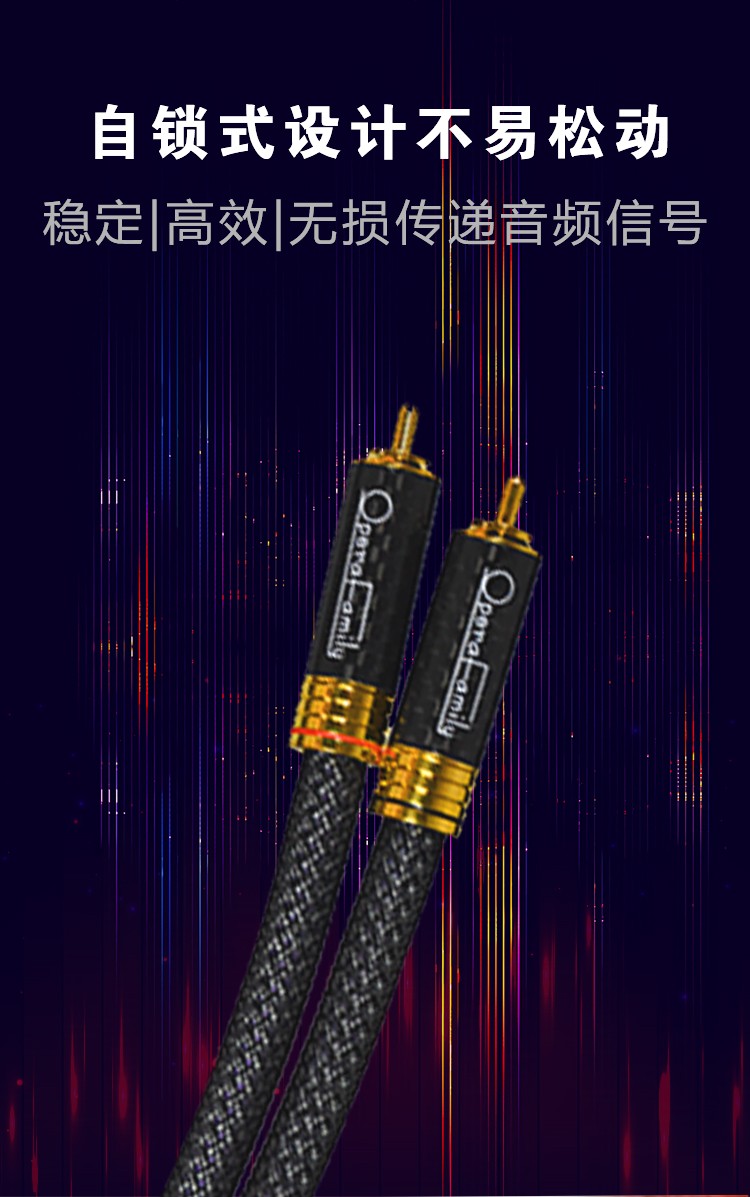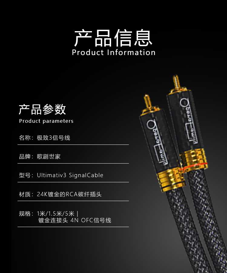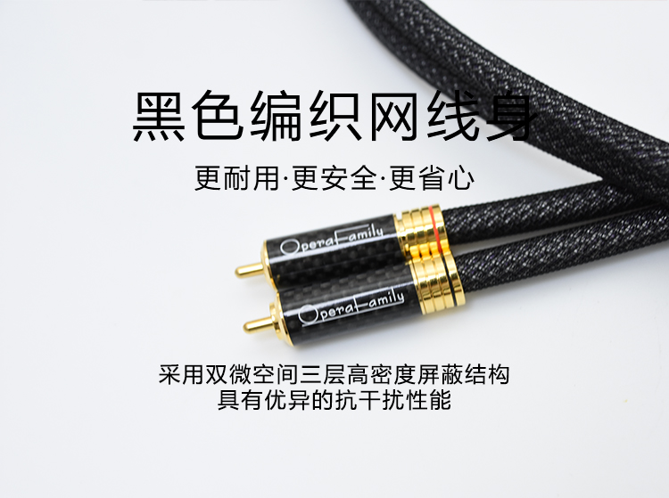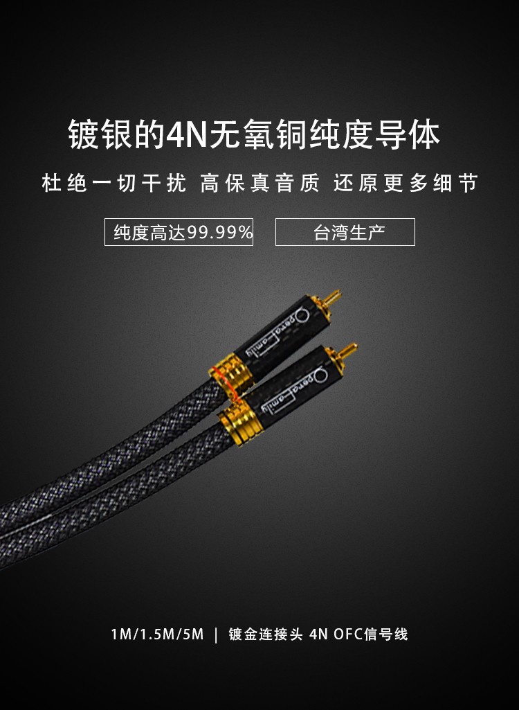 規(guī)格:1m、1.5m、5m 鍍金連接頭 4N OFC信號線 歌劇世家極致3信號線導(dǎo)體采用鍍銀的4N無氧銅純度導(dǎo)體,純度高達(dá)99.9%,24k鍍金的RCA碳纖插頭,自鎖式設(shè)計不易松動,能夠穩(wěn)定、高效、無損的傳遞音頻信號。 5米那條信號線 則采用雙微空間三層高密度屏蔽結(jié)構(gòu),具有優(yōu)異的抗干擾性能。高頻具有更好的延伸,中頻密度感好,低頻快速有力。