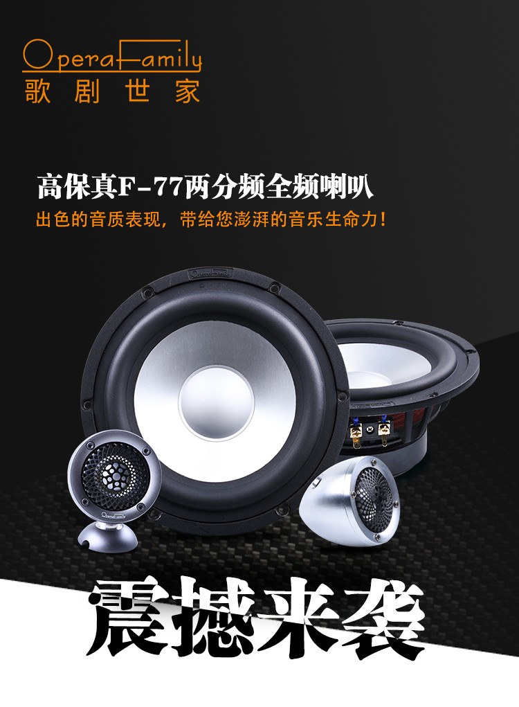 歌劇世家F-77全頻兩分頻喇叭:產(chǎn)品由2寸全頻喇叭和7寸低音單元組成。2寸全頻喇叭單元的單點聲源,很好地解決了高音和中音喇叭的分頻點、相位和延時等問題。全頻喇叭單元則采用了子彈頭設(shè)計的鋁合金箱體,整體剛性強且外觀科技感強。7寸低音單元擁有更大的振膜面積,低頻響應(yīng)更寬。兩款單元都采用了歌劇世家獨家的鋁鎂合金振膜和合金鑄鋁盆架。 產(chǎn)品參數(shù):額定功率:80W / 最大功率:120W / 靈敏度:90dB / 系統(tǒng)阻抗:4Ω