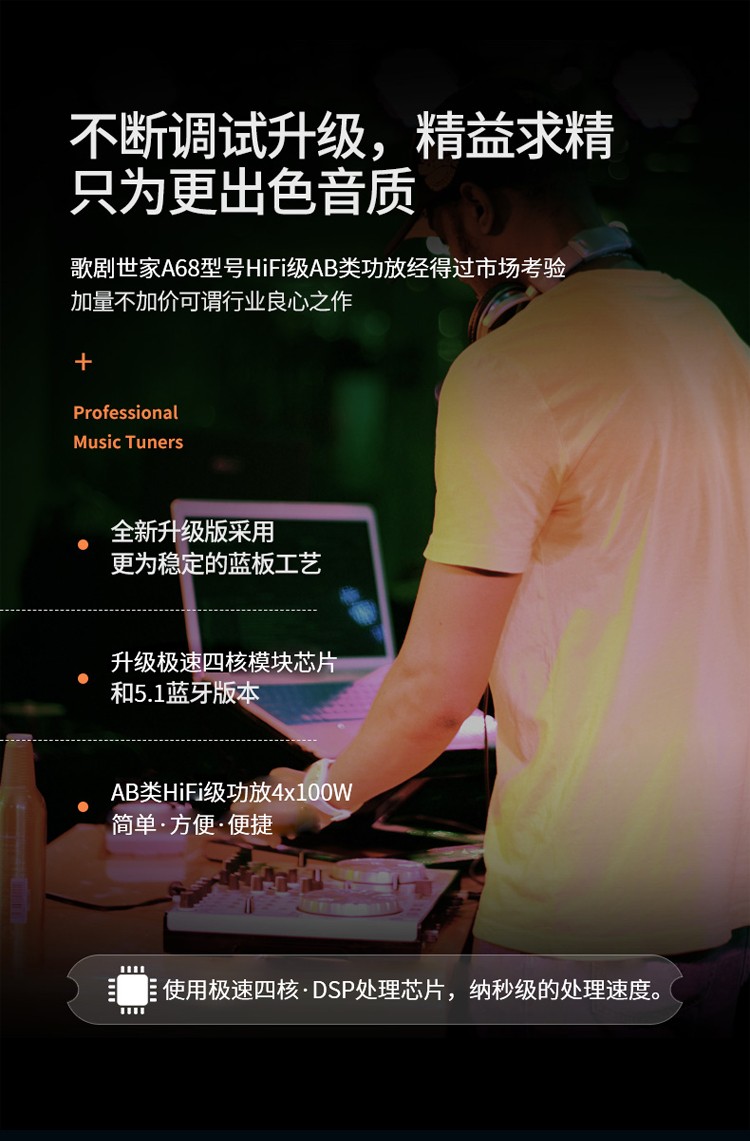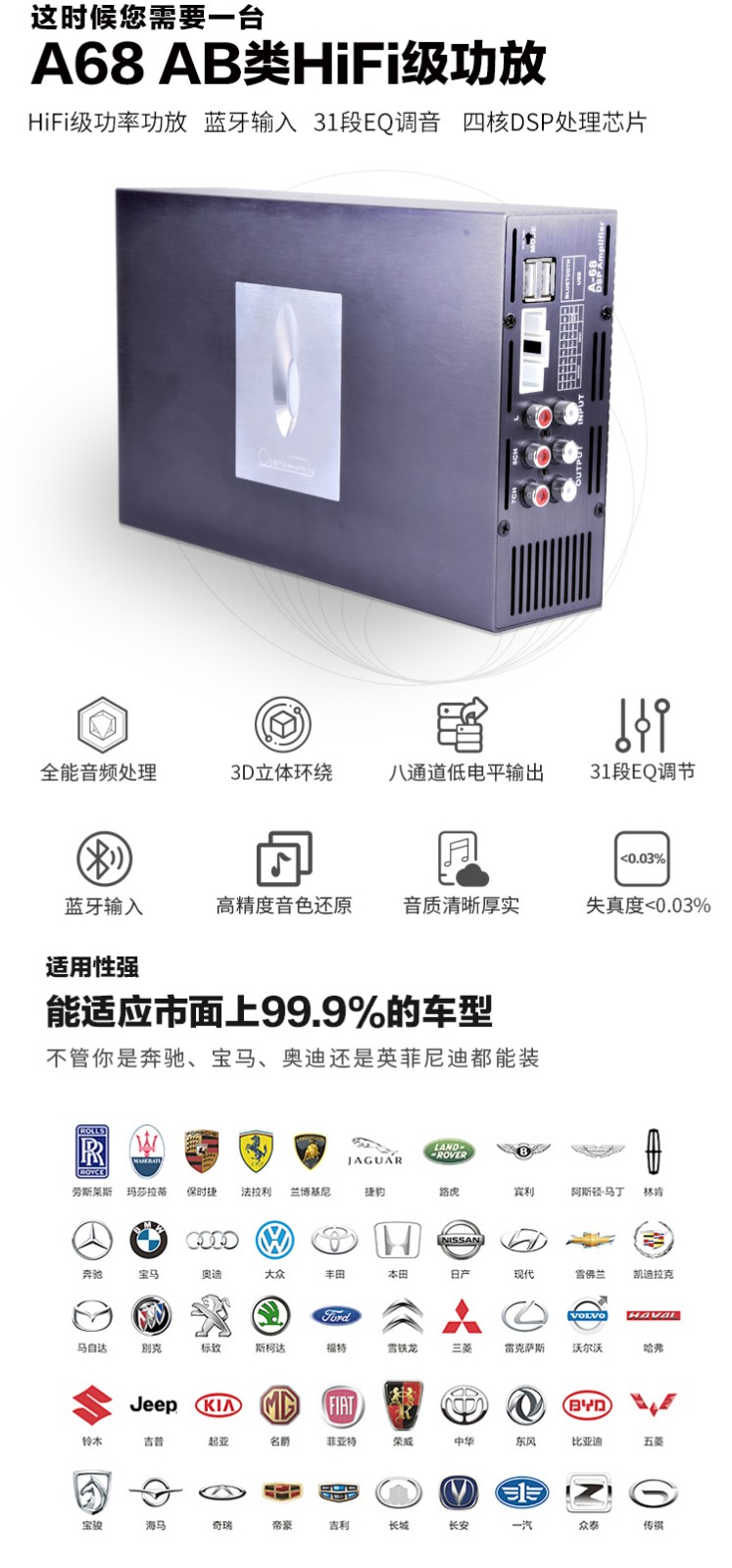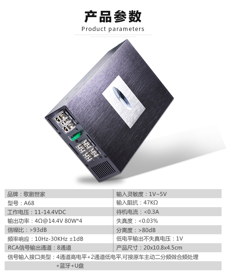 品牌: Opera family/歌劇世家意圖系列 型號: A-68 輸出功率: 其他 輸出阻抗: 4歐姆 失真度: 0.01% 信噪比: 95dBA 汽車音響功放類別: A/B類 汽車音響功放用途: 推套裝喇叭 4進6出,31段EQ,延時、藍牙、4x85W、RMS、A/B類
