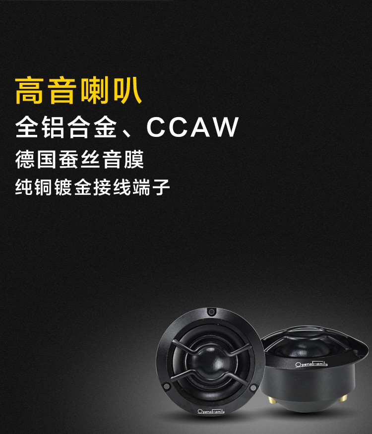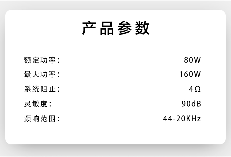 高性能鐵氧體強(qiáng)磁,高通量聲學(xué)原理低失真一體式設(shè)計;高強(qiáng)度一體式鑄鋁盆架,碳纖音盆振膜;雙高性能釹鐵硼強(qiáng)磁,內(nèi)磁設(shè)計;全鋁合金,CCAW,德國蠶絲音膜;純銅鍍金接線端子。 額定功率:80W 最大功率:160W 系統(tǒng)阻抗:4Ω 靈敏度:90dB 頻響范圍:44Hz-20kHz