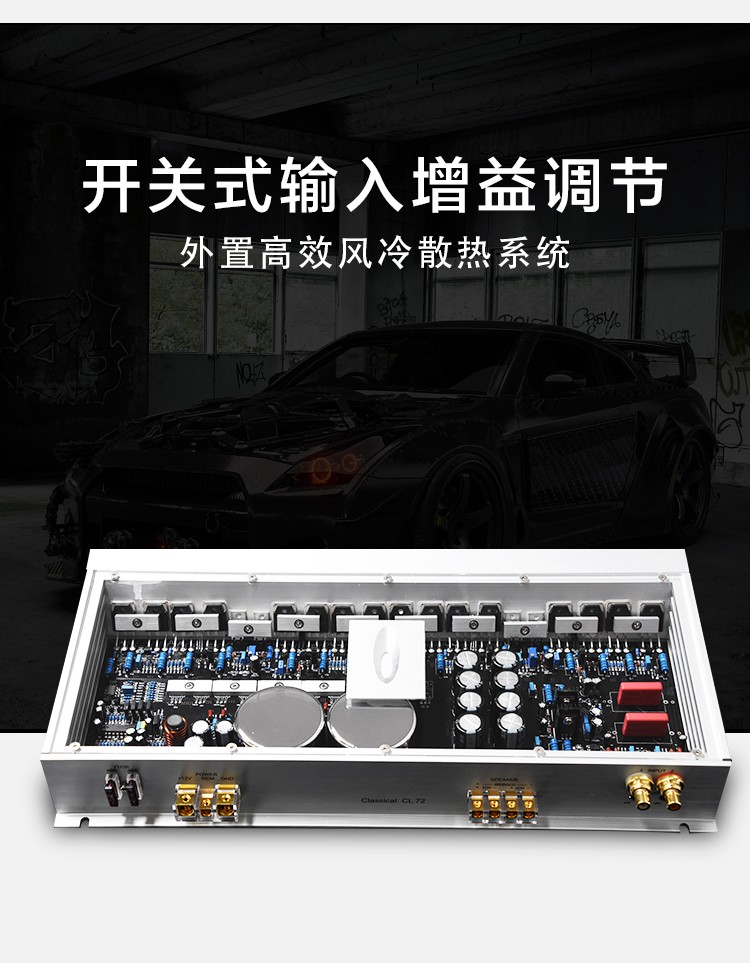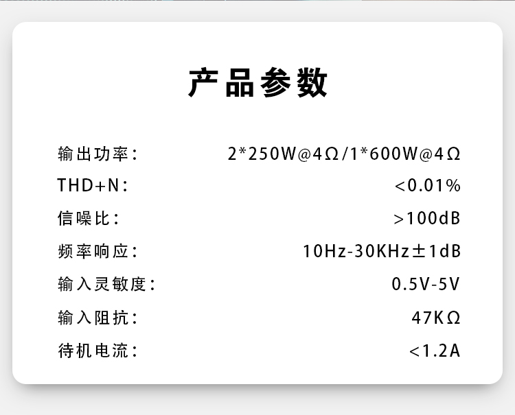兩組獨立電源;定制純銅鍍金RCA座、電源端子、喇叭端子;德國威瑪發(fā)燒級電容;LED透視式外觀設計;開關式輸入增益調(diào)節(jié);外置高效風冷散熱系統(tǒng)。 輸入功率:2x250W@4歐姆/1x600W@4歐姆 THD+N:<0.01% 信噪比:>100dB 頻響范圍:10Hz-30kHz±1dB 輸入靈敏度:0.5V-5V 輸入阻抗:47KΩ 待機電流:<1.2A