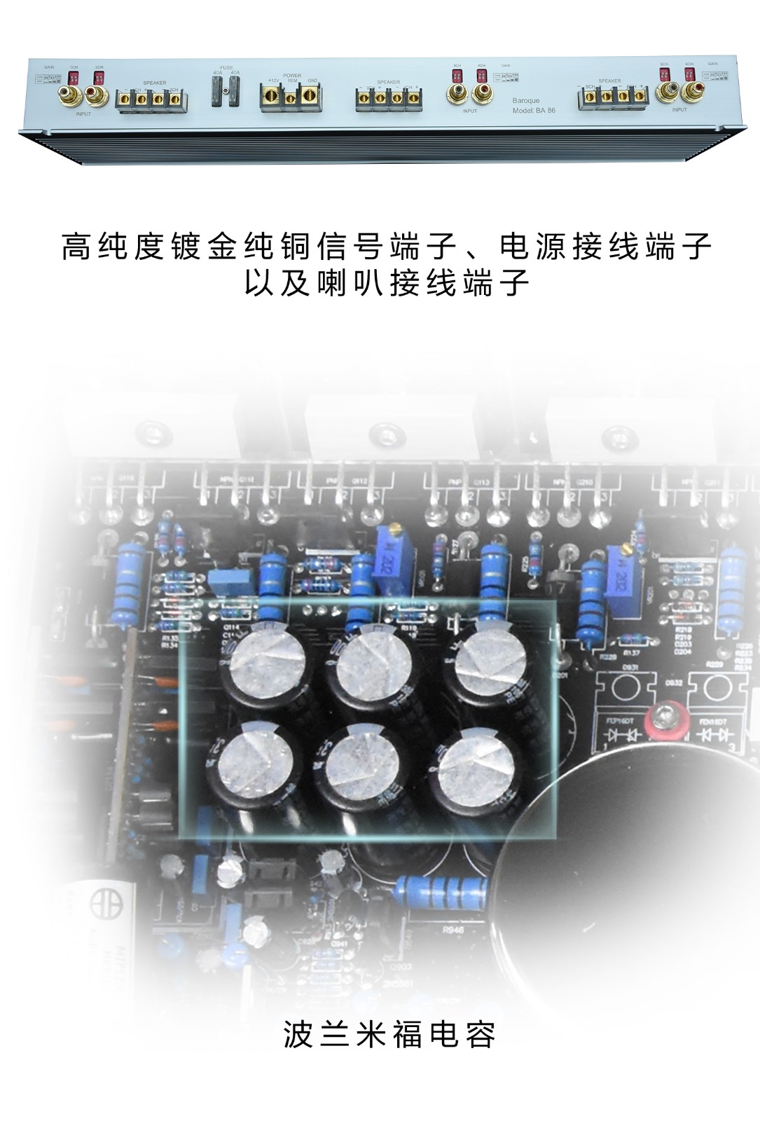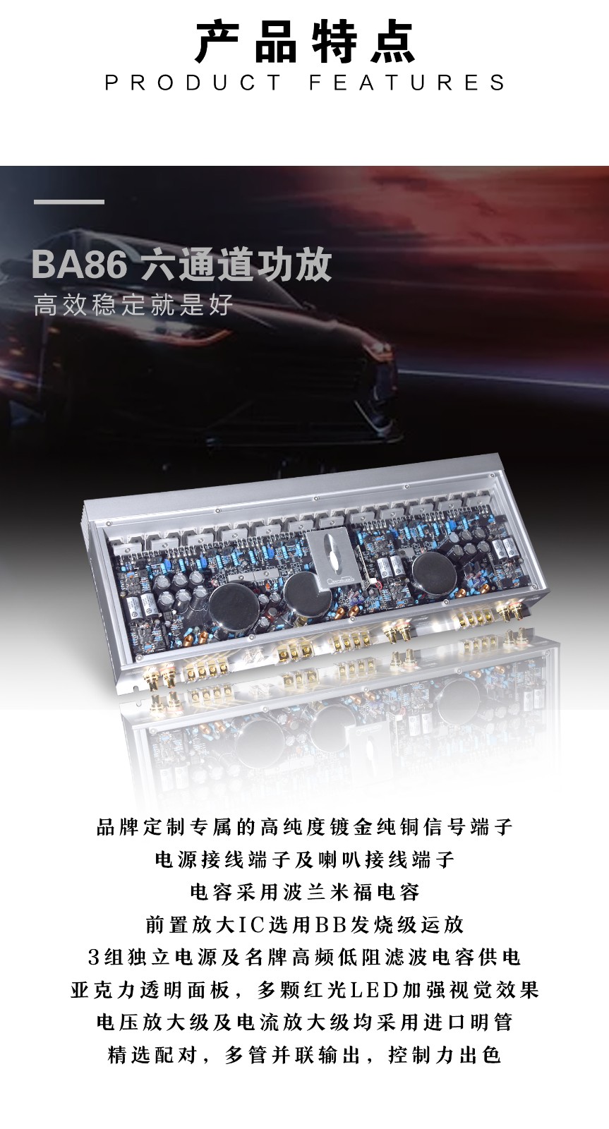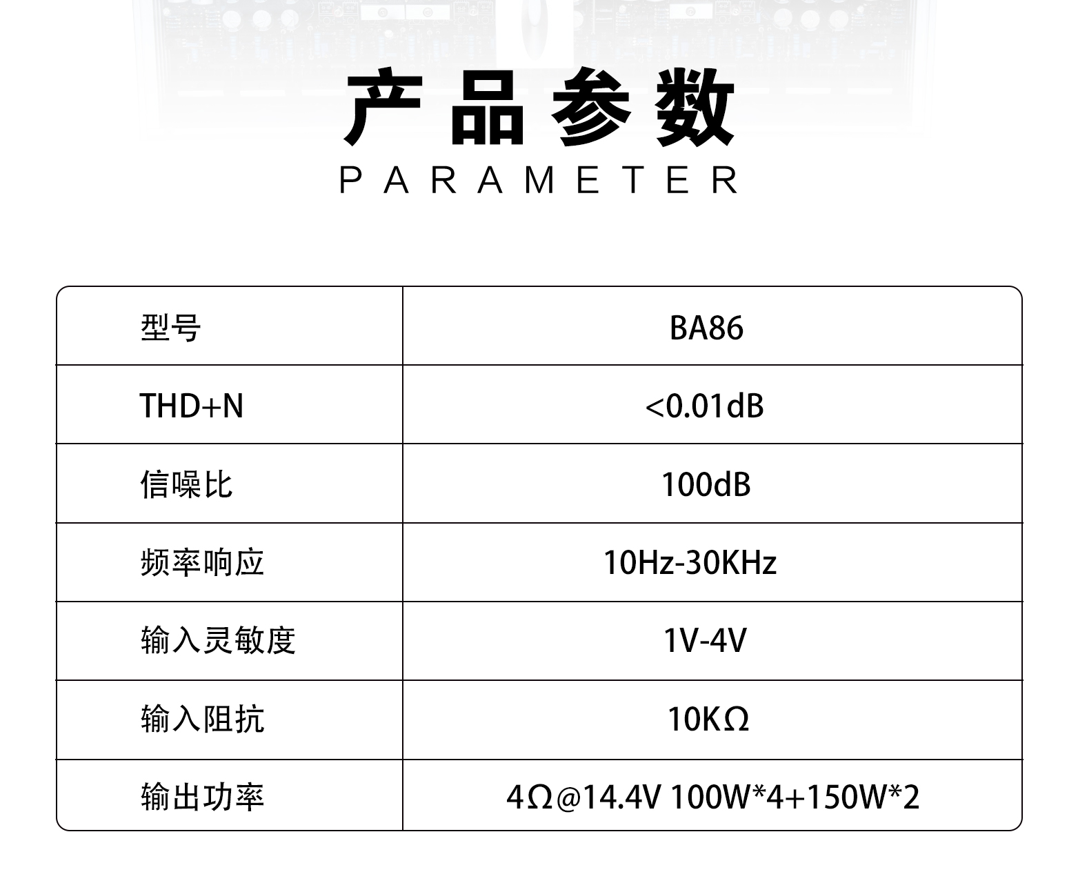 品牌定制專屬的高純度鍍金純銅信號輸入端子、電源接線端子及喇叭接線端子;耦合電容選用德國威瑪發(fā)燒級電容;前置放大IC選用BB發(fā)燒級運放;3組獨立電源及品牌高頻低阻濾波電容供電,亞克力透明面板,多顆紅光LED加強視覺效果;電壓放大級及電流放大級均采用進口音響名管,精選配對,多管并聯(lián)輸出,控制力出色。 輸出功率:6x120W THD+N:<0.01% 頻響范圍:10Hz-30kHz 輸入阻抗:10KΩ 輸入靈敏度:0.5V-4V